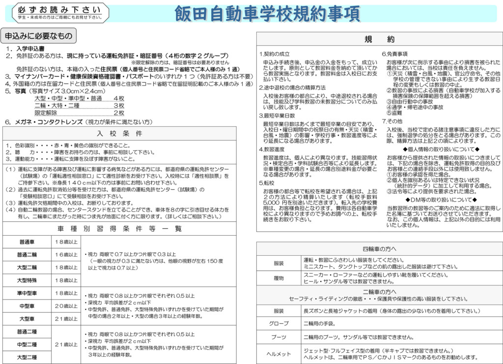 入校初日から技能教習がある場合があります。サンダル・ヒール・スカートは避けてください。