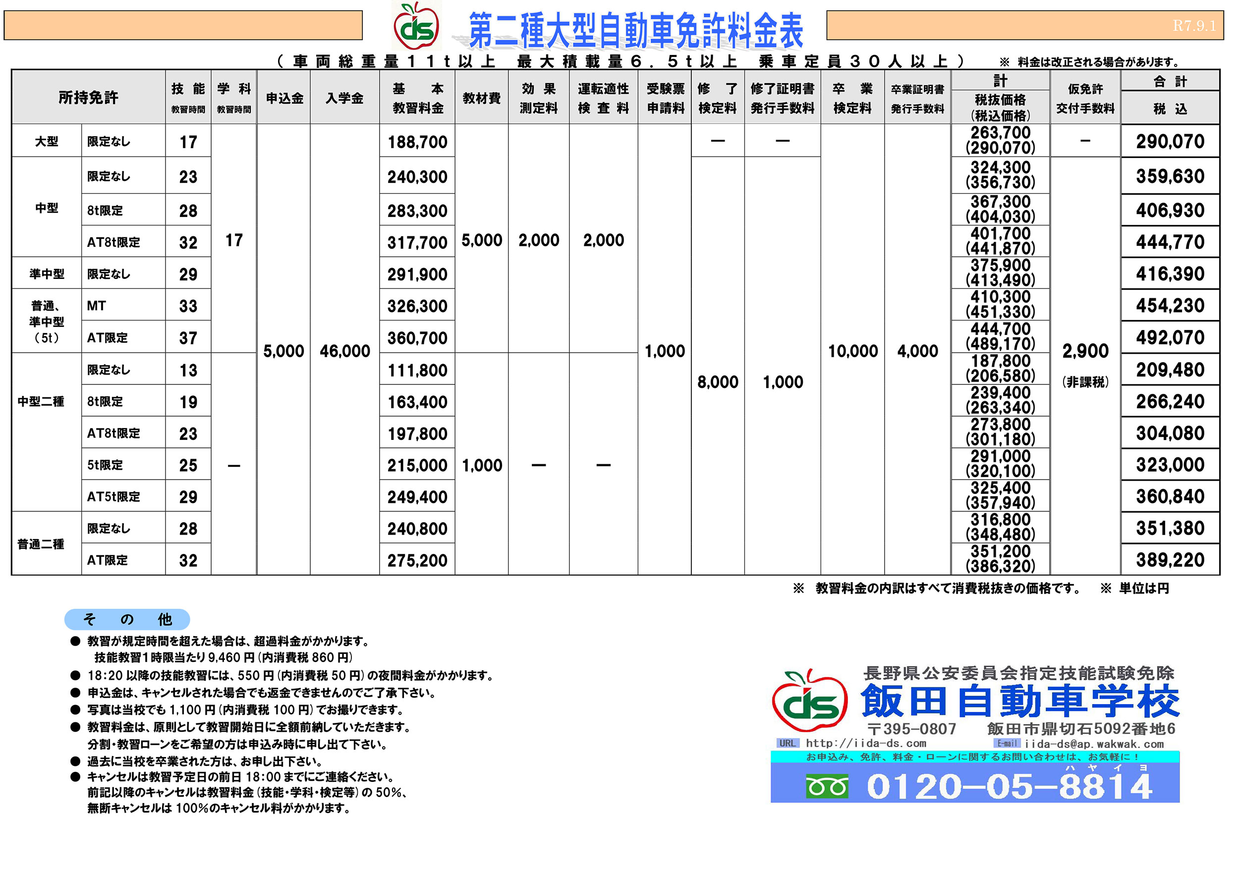 大型自動車二種免許教習料金表