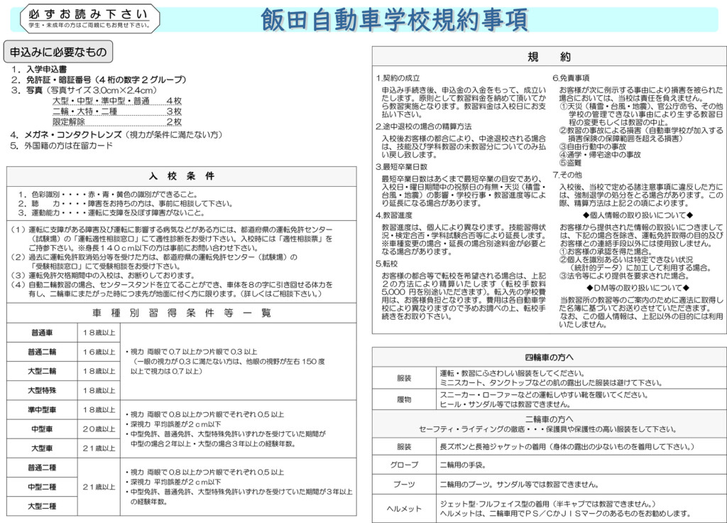 大型自動車免許を取得すると、原動機付自転車 ・小型特殊自動車 ・普通自動車 ・中型自動車 ・大型自動車を運転することができるようになります。飯田自動車学校ではしっかりしたカリキュラムと経験豊富な指導員たちによる丁寧な教習で、大型自動車免許取得を目指せます。仕事の関係で大型自動車免許が必要になり、働きながら取得を目指す方は、夜間や土日教習を利用される方も多くいらっしゃいます。